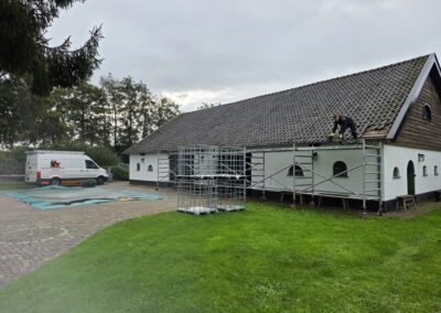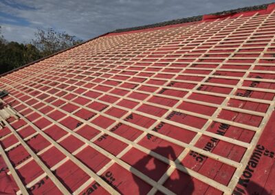 Op de foto’s van dit project is goed te zien hoe het dak stap voor stap is vernieuwd. Eerst zijn de bestaande onderdelen verwijderd, waarna het dak opnieuw is opgebouwd met een degelijke basis. Door te kiezen voor nieuwe folie op het dakbeschot en een correcte opbouw met ventilatie en panlatten, is het dak weer klaar voor de toekomst.